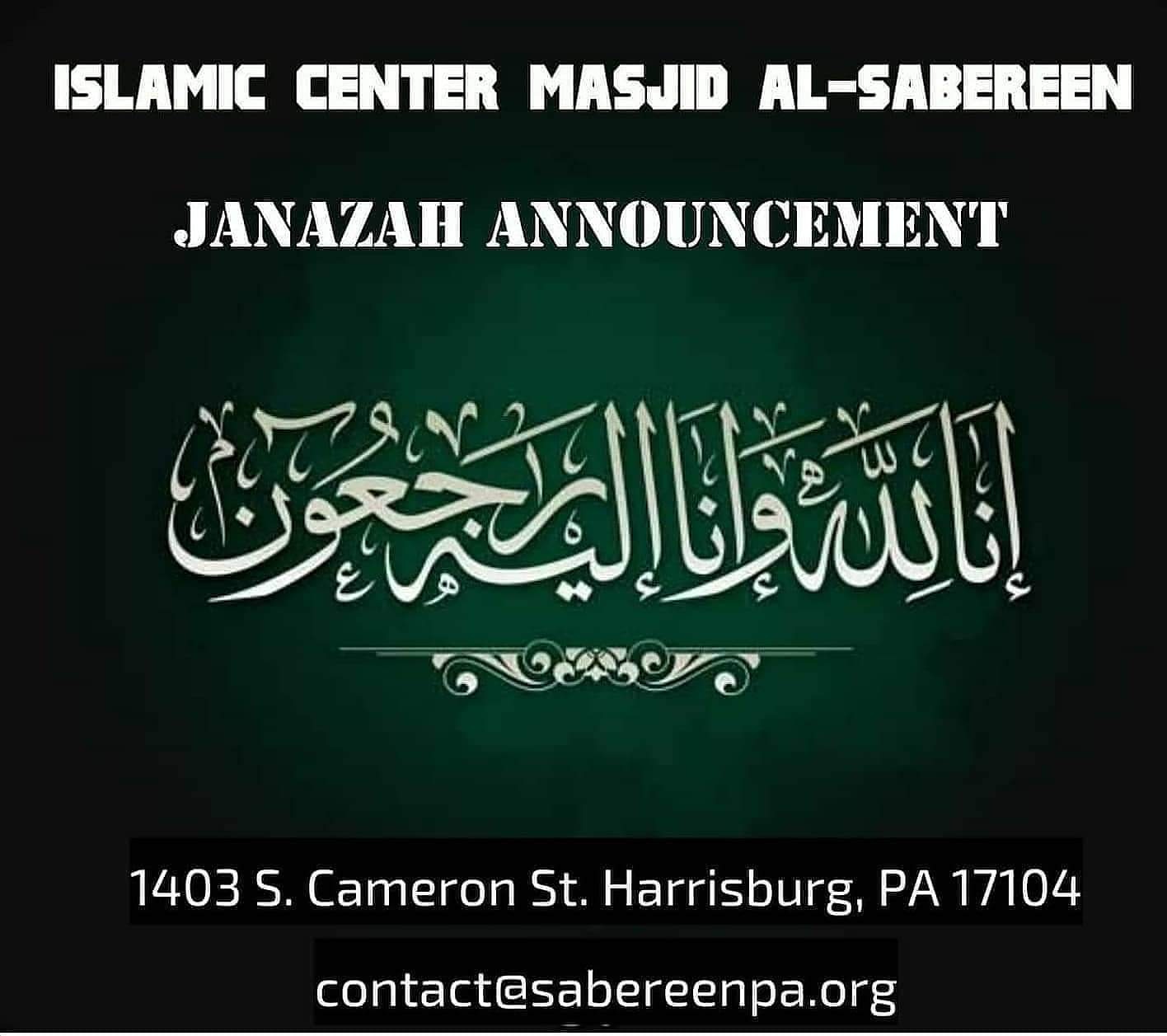 ** Janazah Prayer will be at Sabereen on Wednesday after Asr (5:20) Insh'Allah.**