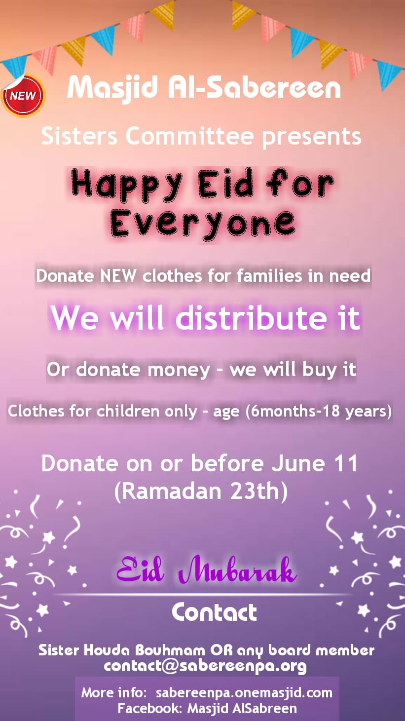 Please support the effort by our Sisters Committee to provide new clothing to the needy during this Eid, insha'Allah. May Allah accept it from all of us.