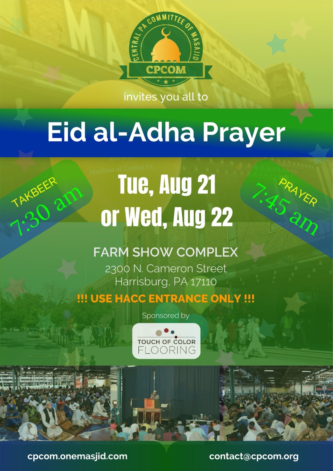 CPCOM (Central Pennsylvania Committee of Masajid) is inviting all of you to come and join the Unified Eid al-Adha Prayer at the Farm Show Complex, on either Tuesday, Aug 21 or Wednesday, Aug 22 (based on moon-sighting) insha'Allah.
