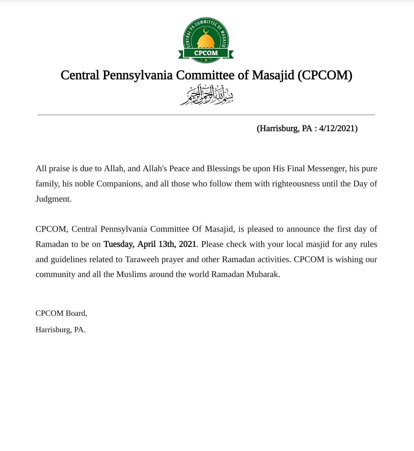Masjid Al-Sabereen as part of Central Pennsylvania Committee of Masajid (CPCOM) is pleased to announce that Tuesday April 13th will be the first day of Ramadan.