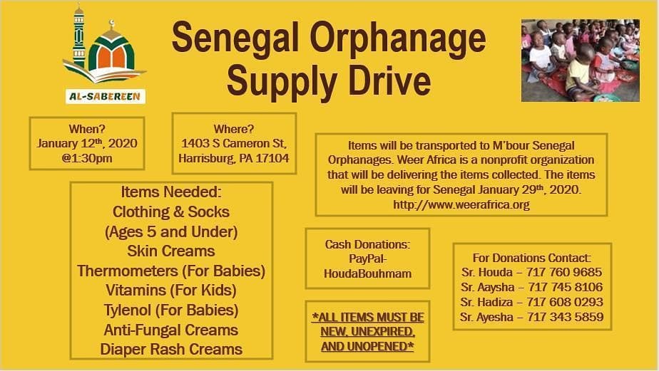 Senegal Orphanage Supply Drive organized by the Sisters Committee. If you missed the items drop of date you can still donate via PayPal.