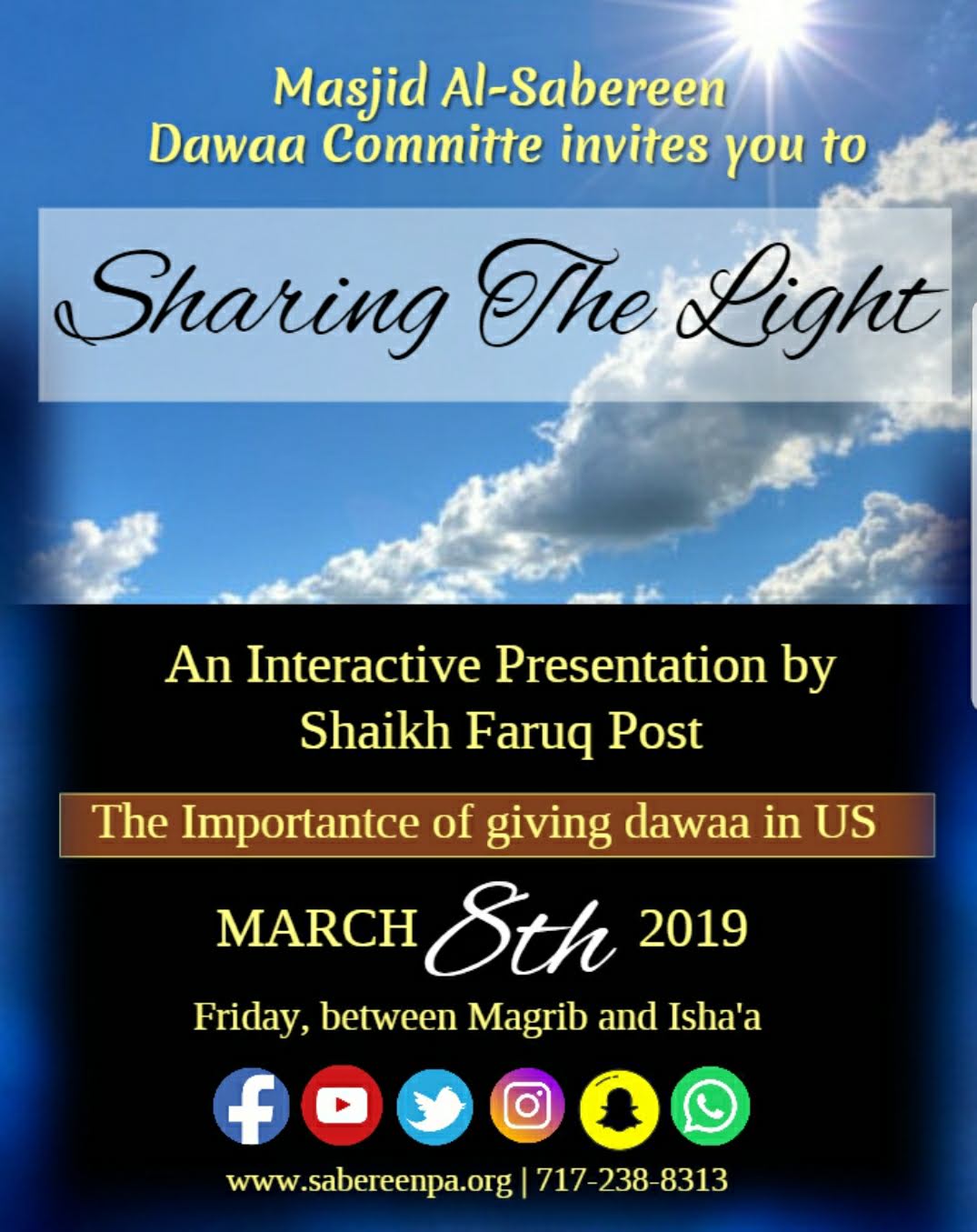 Masjid Al-Sabereen is pleased to introduce the new dawaa committee. The Committee is open for brothers and sisters interested in giving dawaa. Please see the Imam or a board member if you are interested in joining the committee. Our first event is scheduled for March 8th please join us.
