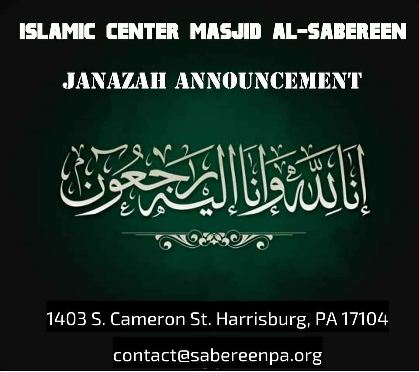 Janazah prayer will be held at funeral home and it is limited to Imams only. This prayer is not open to public. Please remember our sister in your Dua'a. May Allah forgive her, grant her Janat Al-Firdus and give her family patience.