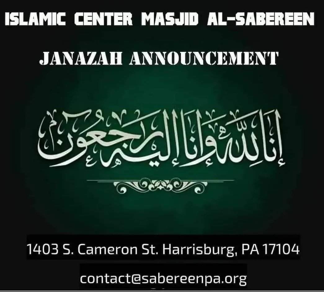 Janazah prayer at Masjid Al-Sabereen tomorrow Thursday after Duhr around 1:30 Insh'Allah.