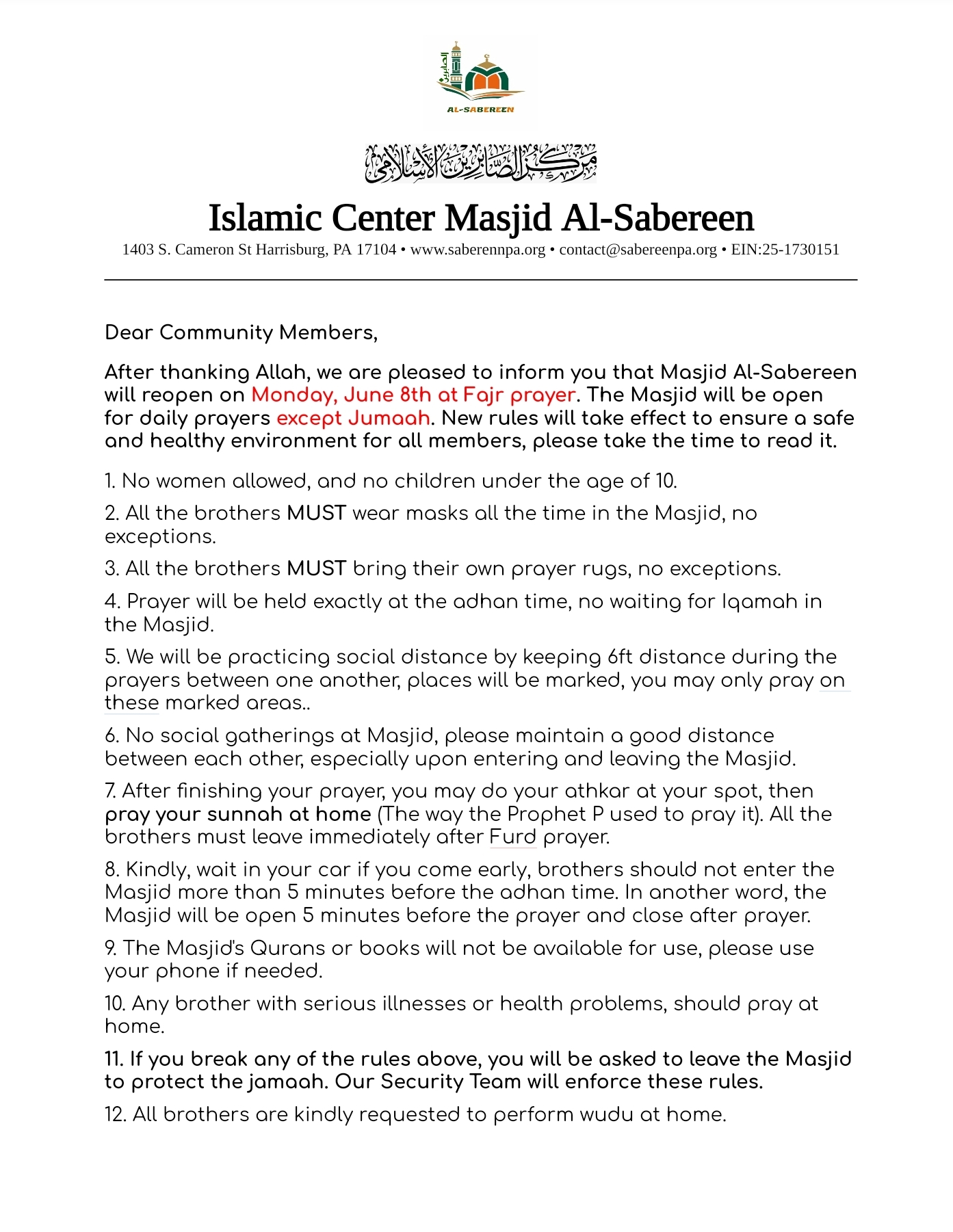 The Masjid Will Reopen Tomorrow (Monday)